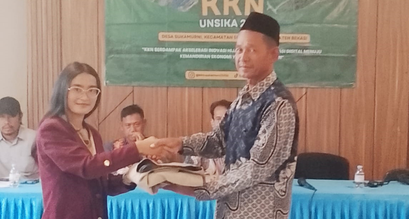 Prosesi Penerimaan Mahasiswa KKNSetelah sambutan, acara dilanjutkan dengan prosesi penerimaan mahasiswa KKN UNSIKA secara simbolis. Penerimaan dilakukan oleh Bapak M. Sidi, selaku Kepala Seksi Kesejahteraan Rakyat Desa Sukamurni, kepada perwakilan mahasiswa KKN UNSIKA Tahun 2026.